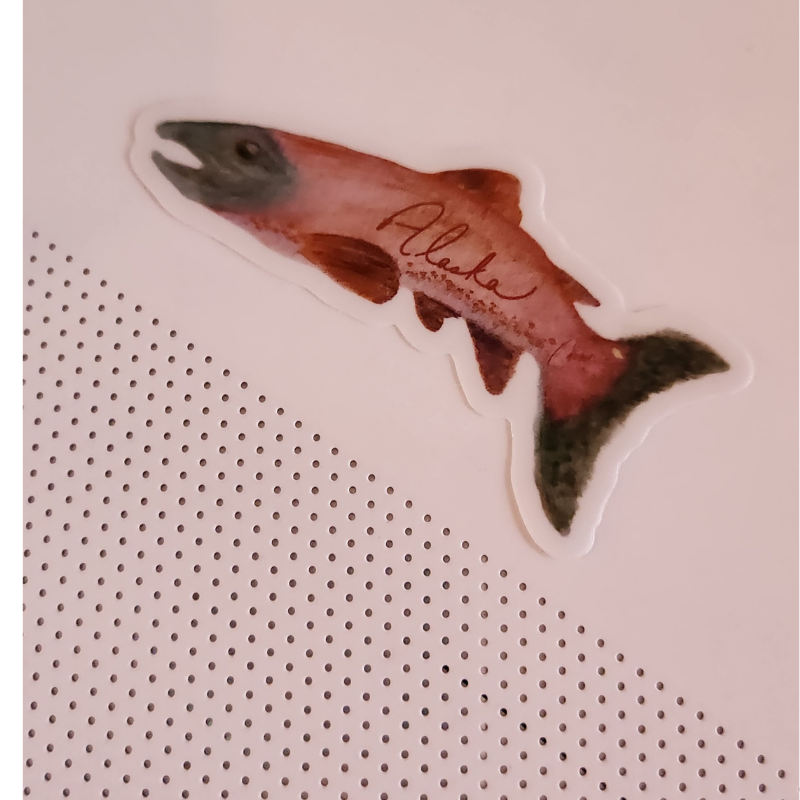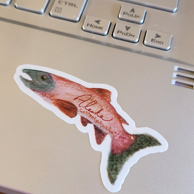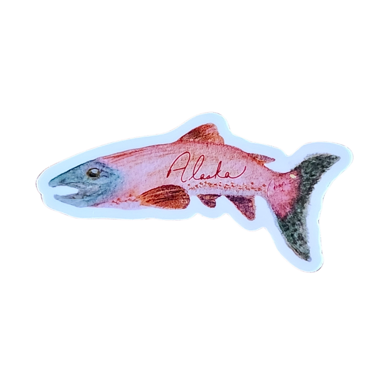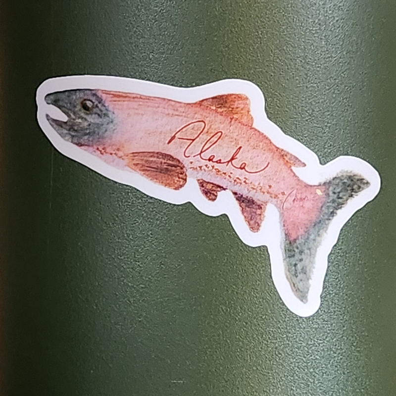 A beautiful sockeye salmon in Alaska die-cut sticker! The design is from an original watercolor painting. Decorate your favorite flask or electronic device with stickers that bring memories of good times! Keep Swimming forward and making your dreams a reality!