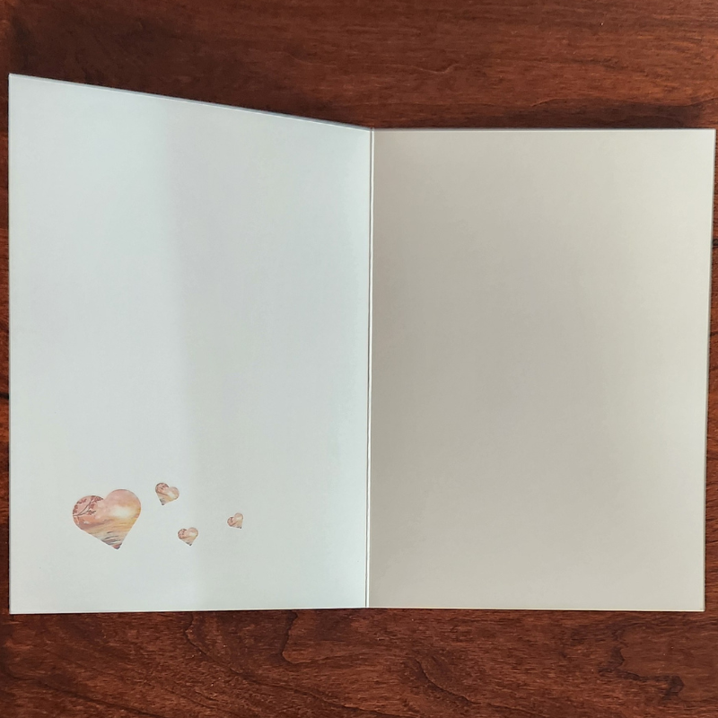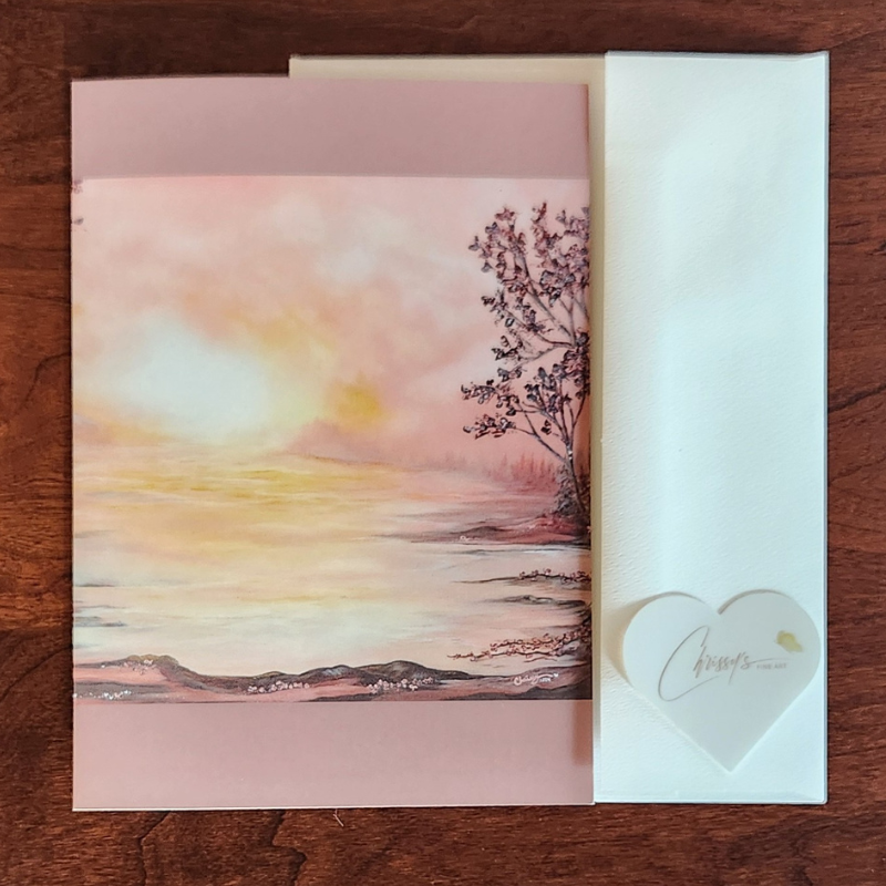 Features a beautiful nature scene from my imagination! The artwork featured in this design was originally hand-painted in acrylics (donated to the Alaska Run for Women organization in 2024 to help raise awareness for breast cancer/ women's health) and was digitized for the card design.