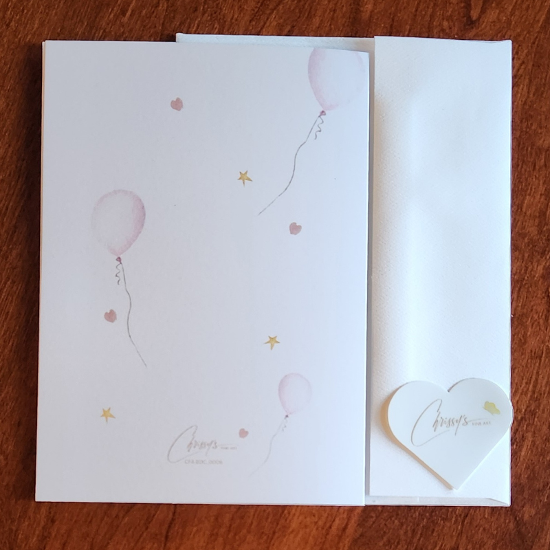 Birthday Greeting Card. Feature: a ballerina, hearts, stars and balloons. The artwork featured in this design was originally hand painted in watercolor and digitized for the card design.