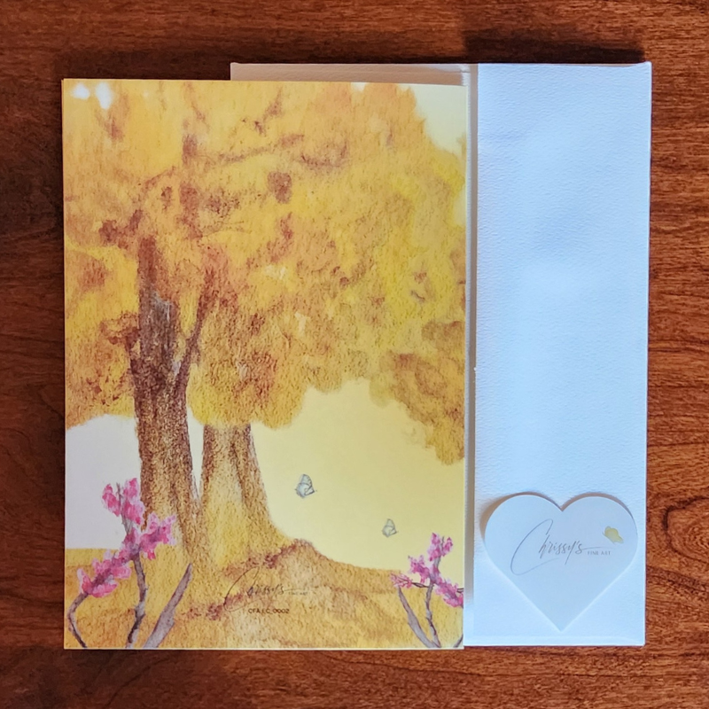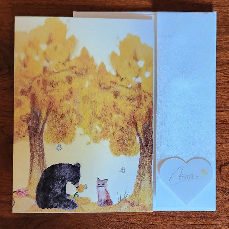 Encouragement Greeting Card. Features a bear, fox, butterflies, trees, heart, and flowers. The artwork featured in this design was originally hand painted in watercolor and digitized for the card design.
