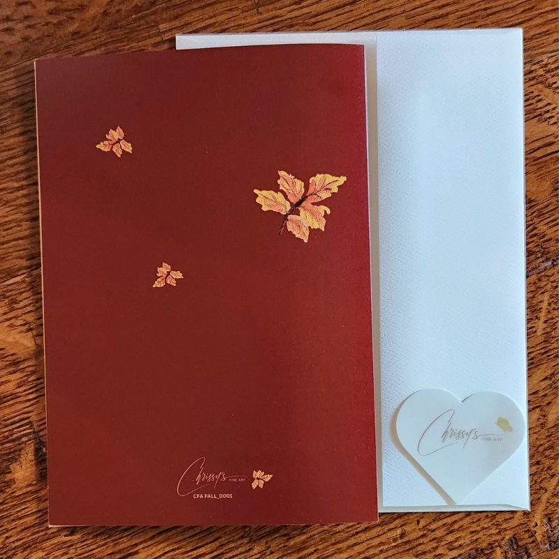 Fall Brilliance greeting card. Features: Fall foliage, pumpkins, and a basket of apples. The artwork featured in this design was originally hand painted in watercolor and digitized for the card design.