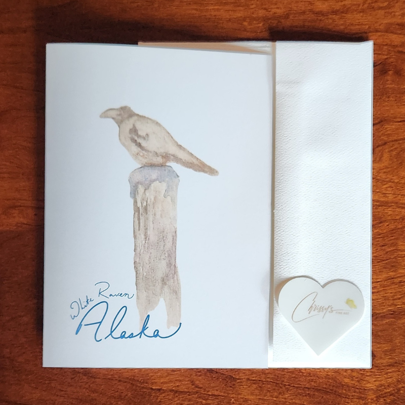 Alaska's Beauty greeting card. Features: The White Raven. The artwork featured in this design was originally hand painted in watercolor and digitized for the card design.