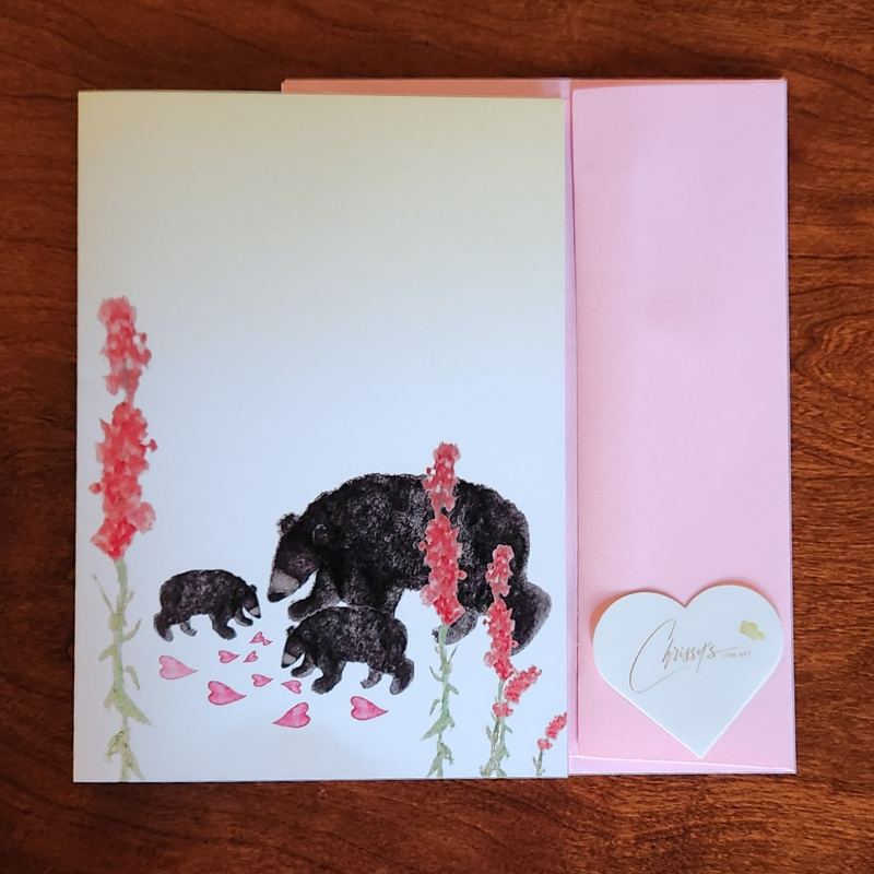 Mother's Day greeting card. Features: Flowers, bears, and heart petals. The artwork featured in this design was originally hand painted in watercolor and digitized for the card design.