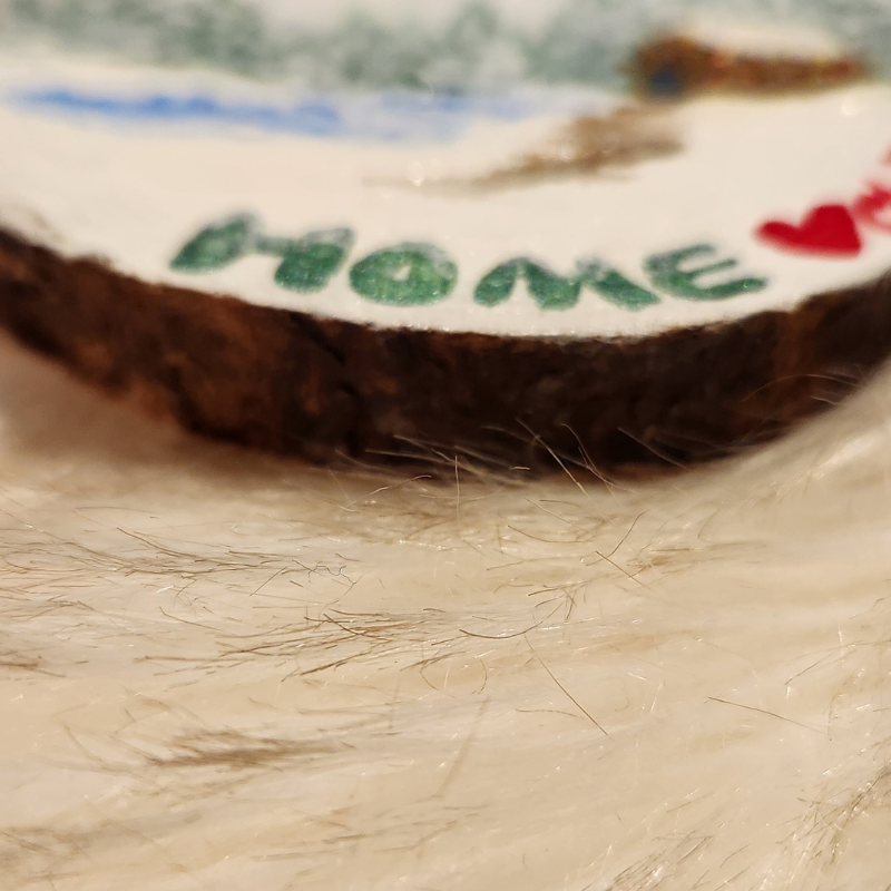 A one-of-a-kind hand-painted ornament of a winter scene with cabin on one side and the other featuring a winter scene with two snowmen. Enjoy a beautiful work of art hanging from your tree, or gift to another kind soul so they may enjoy it during the holiday season or throughout the year!