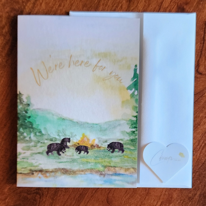 Get Well Soon Greeting Card. Features bears, and a campsite landscape. The artwork featured in this design was originally hand painted in watercolor and digitized for the card design.