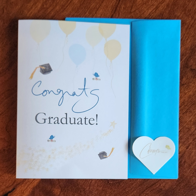 Graduation greeting card. Features: Caps, stars, balloons, butterflies, and diploma. The artwork featured in this design was hand-painted with watercolors that were digitized for the card design.