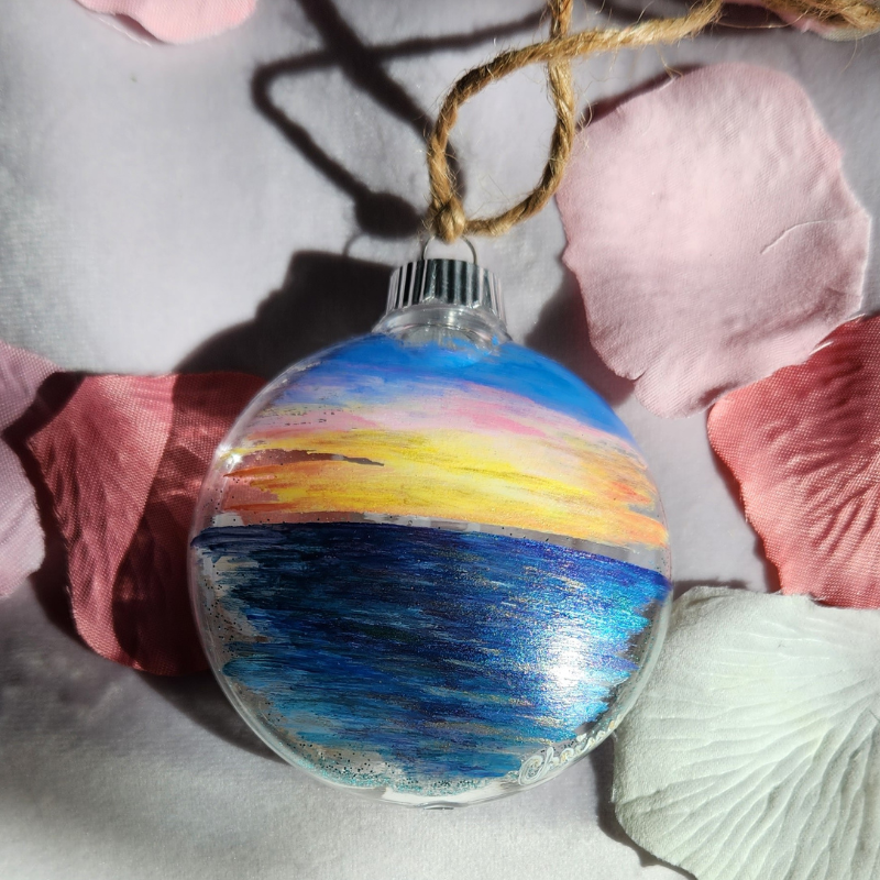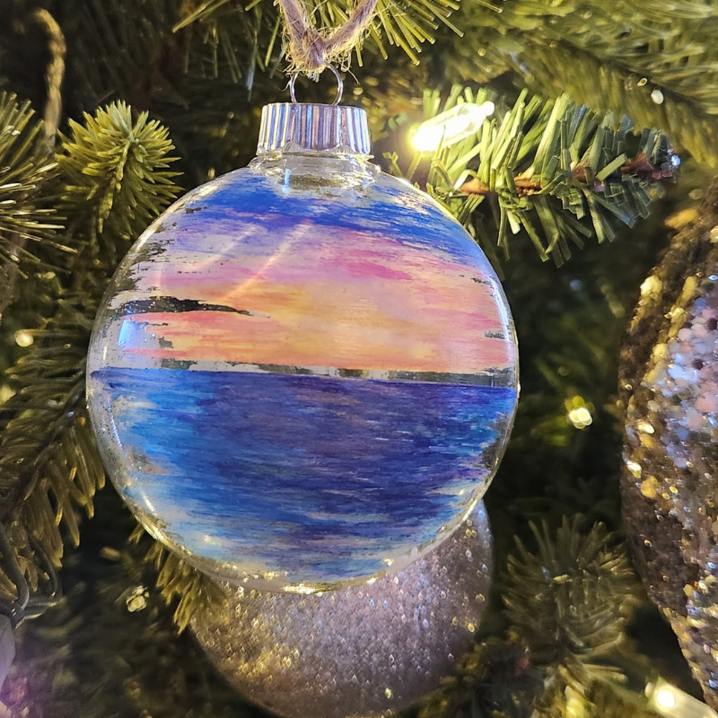 A one-of-a-kind hand-painted ornament of a sunset in Hawaii! A unique gift for someone you cherish or for your own home. Enjoy a beautiful work of art hanging from your tree or from something else to enjoy throughout the year!