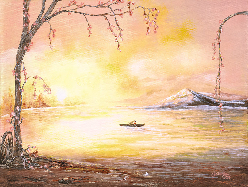 Original acrylic painting: Titled: "Present" Featuring a beautiful lake scene with the glow of romance in the brisk evening air. In honor of love and how miraculous things happen with its presence.