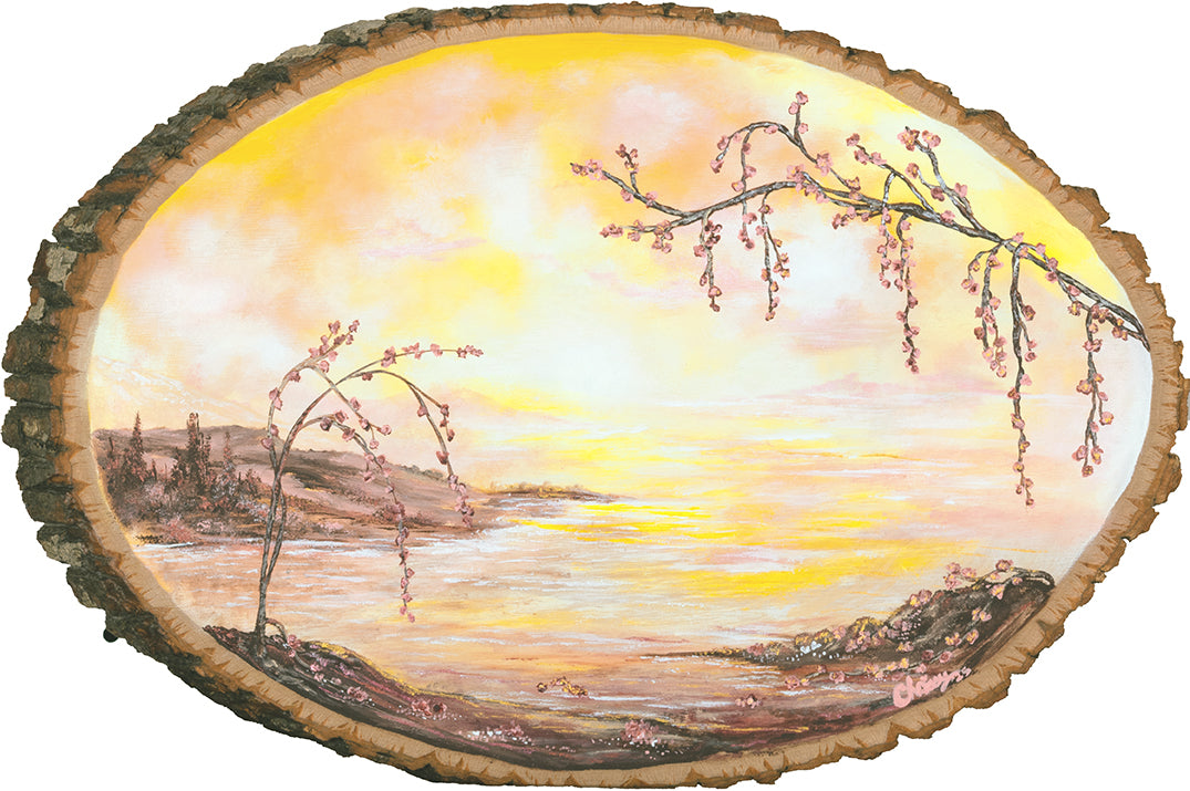 Original acrylic painting on bass wood: Titled: "With Grace" Featuring cherry blossom trees with a beautiful sunset of warmth and tranquility.