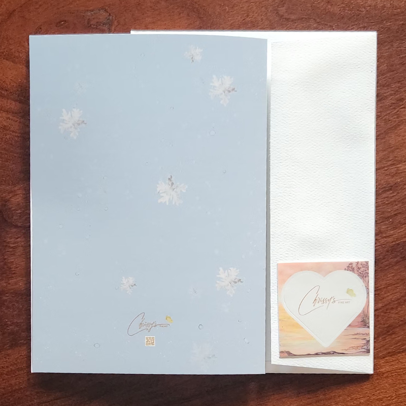 Greeting Card. Features a beautiful winter scene. The main artwork featured was done in watercolor that were digitized.