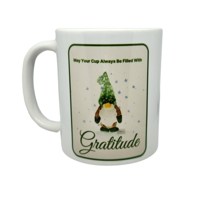 One side features a gnome with the message: May your cup always be filled with gratitude.
