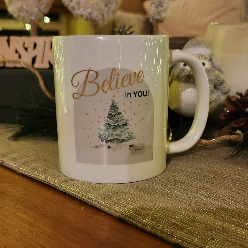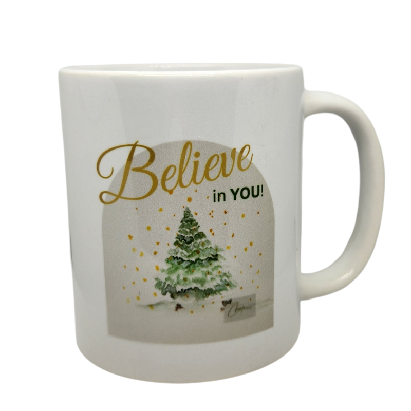 Other side features a spruce tree scene with the message: Believe in YOU!